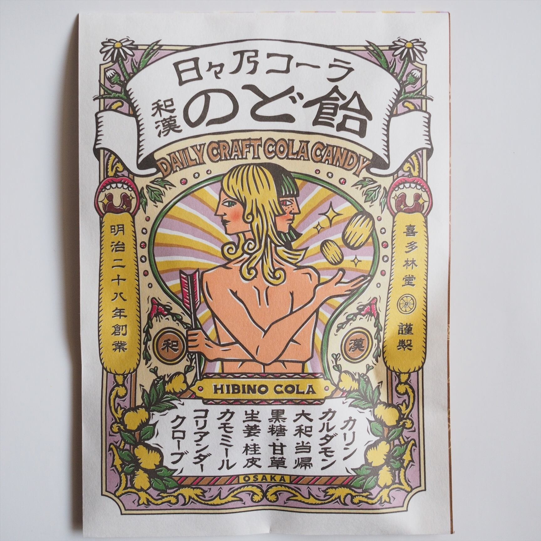 レトロな薬袋からインスパイアされた懐かしさも感じるパッケージは、贈り物にもピッタリな印象的なデザインです。A5サイズの袋の中には約15粒(57g)ののど飴が。
