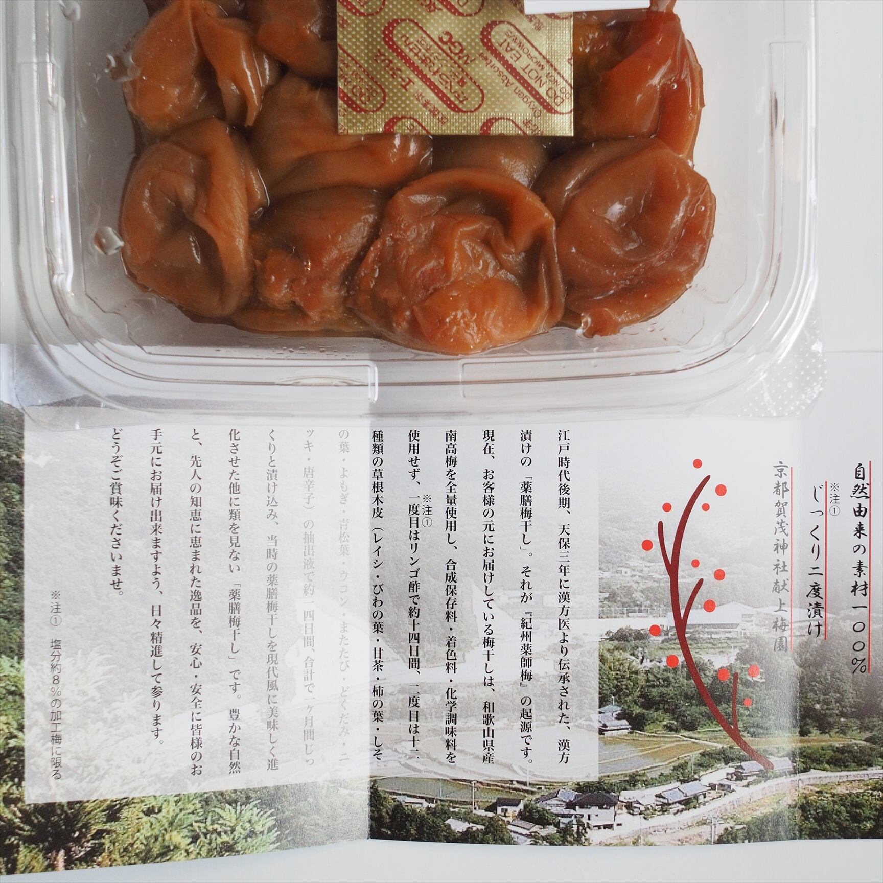 原材料:梅(和歌山県産)、漬け原材料(還元水飴、発酵調味料、食塩、果糖ぶどう糖液糖、醸造酢(リンゴを含む)、レイシ、ビワの葉、どくだみ、しその葉、とうがらし、柿の葉、よもぎ、ニッキ、青松葉、ウコン、マタタビ、甘茶)/酸味料